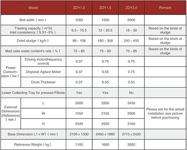 We have two types of belt filter press(ZDY model, DNY model).Belt filter press is used to dewater the thickened sludge in between two belts filtering the water. continuous operation is a great advantage.