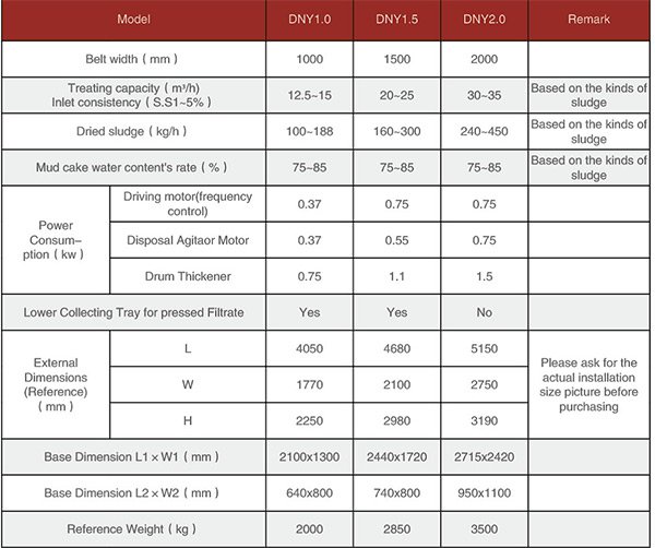 DNY Belt thickening belt dehydrator, it is also mainly used for processing the sludge which is not concentrated in the thickening pool (such as A/O residual sludge, SBR residual sludge), it also has two functions: concentration and dewatering. Its structure is different from Rotary drum thickening belt dehydrator, the sludge is dehydrated by the belt gravity, this device is used in the higher capacity.