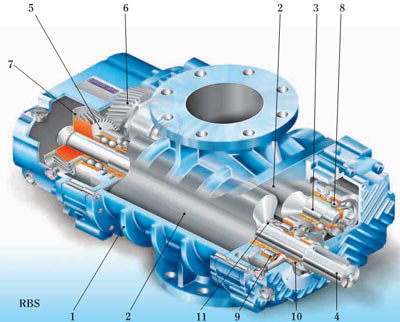 «RBS» - нова прогресивна роторна повітродувка, яка працює за принципом позитивного витиснення потоку, сконструйована спеціально для роботи у складі систем «ROBOX». Серцем повітродувки є два ротори з трьома лопатьми особливої форми, які разом із новою системою Низької Пульсації забезпечують залишкову пульсацію потоку нижче 2% від робочого тиску. Вали із збільшеними розмірами дозволяють досягти більш високого робочого тиску і високих швидкостей обертання. Підшипники і шестерні посиленої конструкції із загартованої стали здатні витримати не менше 100 000 годин надзвичайно високих навантажень. Охолодження деталей повітродувки і мастила при робочих температурах повітря до 150ºС відбувається природним чином. При необхідності нагнітання газів з більш високою температурою можлива установка мастильно-водяного теплообмінника. Інноваційна роторна повітродувка «RBS» спеціально розроблена для цього типу обладнання.