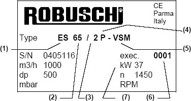 | 1) Конфігурація установки «ROBOX» ES: із звукозахистом EL: без звукозахисту 2) Типорозмір повітродувки від 15 до 155 3) Типорозмір «ROBOX» от 1 до 5 4) Призначення P тиск V вакуум C замкнутий цикл 5) Аксесуари VSM розвантажувальний клапан SNT електронний моніторинг, годинниковий 6) Виконання 0001 7) Технічні дані |