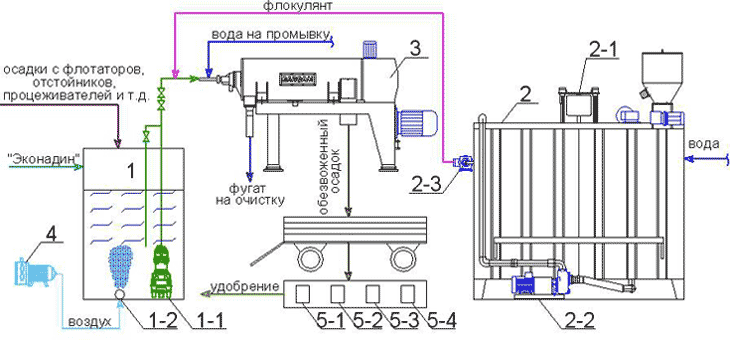 1 – аэробный стабилизатор осадка, 1-1 – насос погружной (Фаджолати, Италия), 1-2 – аэратор, 2 – двухкамерная установка приготовления и дозирования флокулянта, 2-1 – электромешалка, 2-2 – насос подачи концентрата флокулянта в расходную камеру, 2-3 – насос подачи рабочего раствора флокулянта (Этатрон, Италия), 3 – декантерная центрифуга (Баргам, Италия), 4 – воздуходувка (Беккер, Германия), 5-1, 5-2, 5-3, 5-4 – траншеи компостирования (Потенциал-4, Украина)