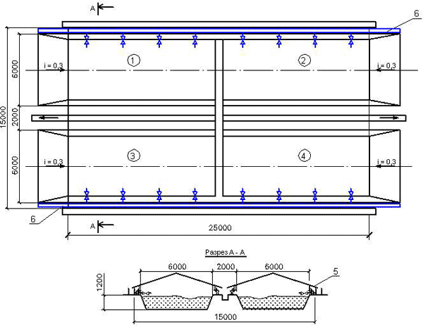 В качестве примера приводятся инженерные решения по компостированию осадка завода по переработке семян подсолнечника, которыми предусмотрено для получения компоста из обезвоженного осадка строительство двух двухсекционных траншей из монолитного железобетона с размерами в плане 26х 6,25 м (рис. 2).