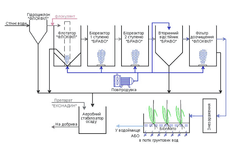 Установки “ФЛОКФИЛ” представляют собой блочно-модульный комплекс с блоками флокуляции, флотации, отстаивания, фильтрования и, при необходимости, биосорбции и биоокисления. В блоке флокуляции происходит корректирование окислительно-восстановительного потенциала (Eh) благодаря подаче воздуха, а также использованию различных препаратов (флокулянтов, биопрепаратов). В процессе флокуляции происходит также укрупнение мелкодисперсных примесей, изменяется их агрегатное состояние. В блоках флотации и отстаивания происходит процесс разделения фаз с извлечением загрязнений в шлам и осадок, которые удаляются в блок аэробной стабилизации и уплотнения осадка где с помощью дополнительно введенных биопрепаратов, например, ЭКОНАДИНА или ТРОФОЙЛА, для биосорбции и биоокисления органических веществ образуется биогумус.